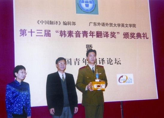 广东外语外贸大学陈建平副校长和《中国翻译》杂志副主编杨平女士为本届竞赛汉译英一等奖获得者、南京解放军国际关系学院的郑宇颁奖