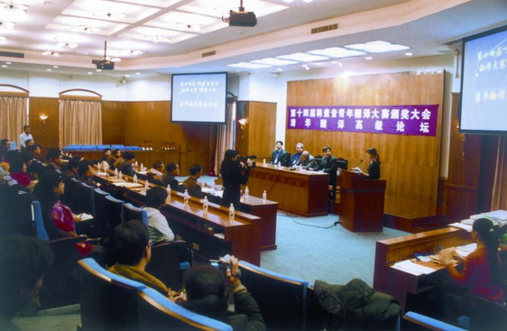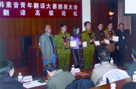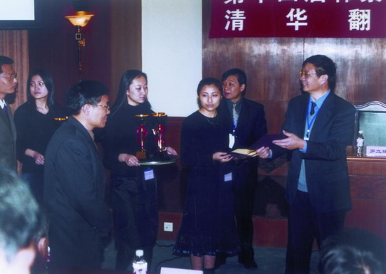 时任中国译协常务副秘书长孙承唐(左一)及中国英汉语比较研究会会长杨自俭(右一)为获二等奖的参赛者颁奖
