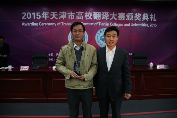 从今年开始,天津市教委将天津市高校翻译大赛确定为市级学科精品赛事。大赛共设英、日两个语种四个赛项。承办单位中国民航大学在颁奖现场首次创新性增加了英汉、日汉翻译现场有奖抢答环节,同时在中间穿插日语歌曲、英语歌曲表演,现场气氛热烈。天津外国语大学蔡润光、牛津、狄朋霞、吕晓梅、南开大学滨海学院魏良荣、天津科技大学唐靓嫱、河北工业大学谢亚岚、天津师范大学郭晓璞、刘泽莎、天津理工大学彭祥彬分别荣获2015年高校翻译大赛英译汉、汉译英、日译汉和汉译日四项比赛的一等奖。