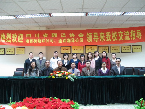 4月19日,应成都纺织高等专科学校外文系邀请,四川省译协副会长张梦太、连真然,副秘书长张一鸣等省译协领导及成都语言桥翻译有限责任公司总经理朱宪超、成都通译翻译公司总经理贺晓荣一行到成都纺织高专调研,听取了该校外文系主任王朝辉教授及各学科教研室主任就该校外语学科建设、人才培养、社会实践的情况介绍并与该校外语教学骨干教师座谈。双方就进一步加强校企合作,扩展和密切高校与行业协会、企业的联系,找准专业与企业的供需关系,有针对性地培养具有实际技能的高水平外语人才进行了讨论,并具体研定了由省译协选派有丰富实践经验的专家不定期到该校讲学,对教师和学生进行业务技能培训;由四川省知名翻译企业向教师和学生提供观摩、见习和实习机会,开展学术交流等合作方案。成都纺织高专党委书记王允昌、副校长夏平专程到会发表了指导性意见。