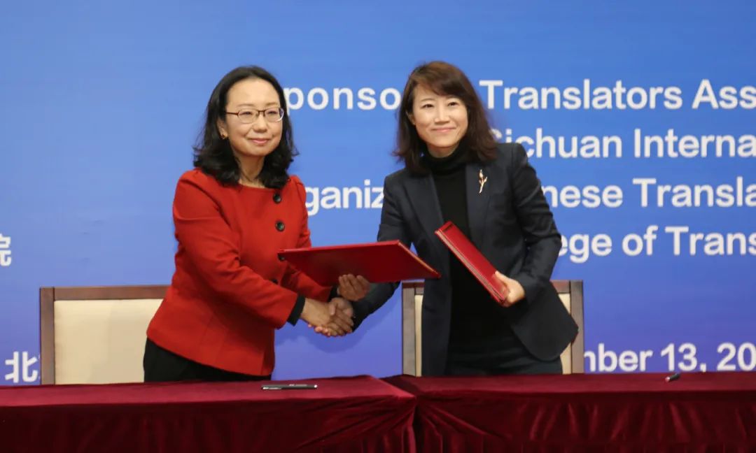 中国翻译协会与北京第二外国语大学代表签署合作备忘录。
