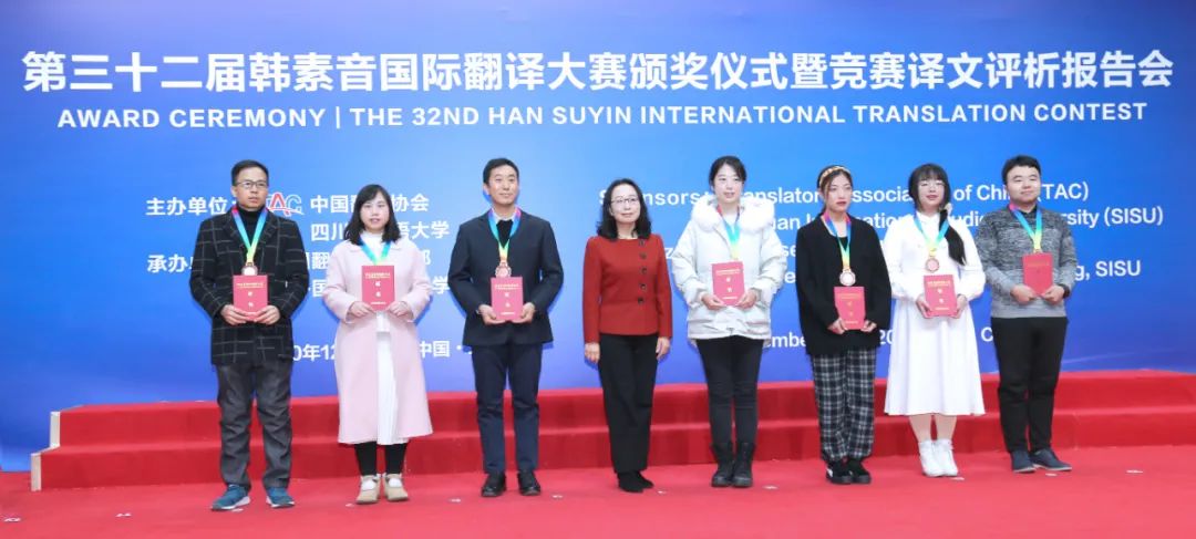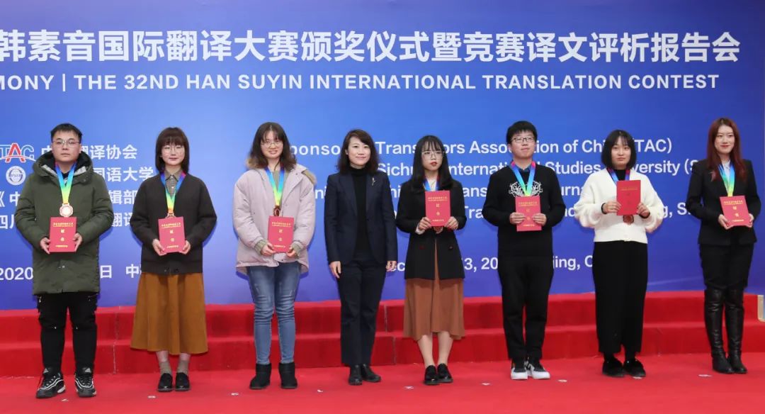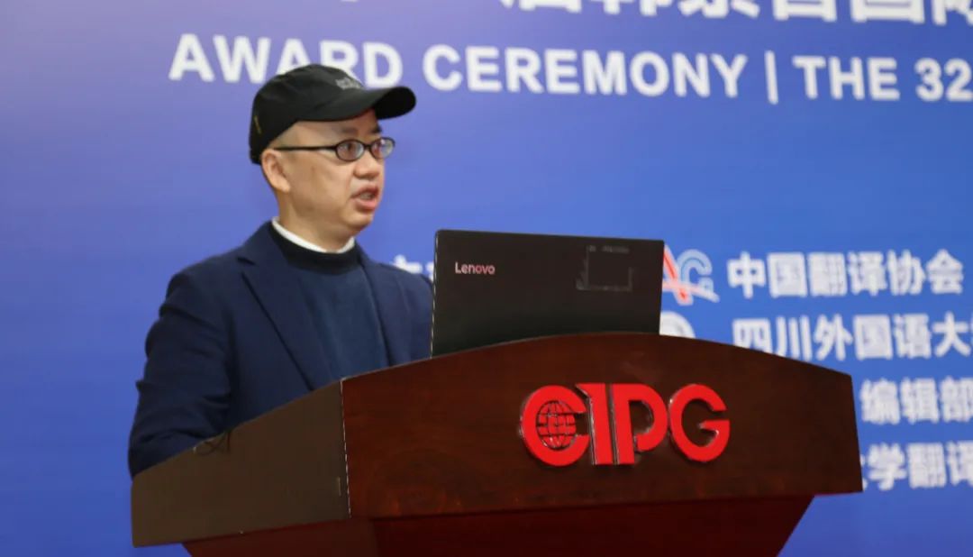 四川外国语大学翻译学院院长胡安江为优秀奖获奖代表颁奖。