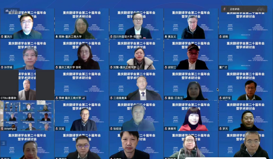 12月17日,由重庆翻译学会和四川外国语大学主办、重庆工商大学承办的重庆翻译学会第二十届年会暨学术研讨会以线上方式隆重召开。与会专家学者围绕“翻译与中国文化国际传播”这一主题展开了热烈研讨。会议和直播平台上参会者总计近3000人。开幕式由重庆工商大学外国语学院院长周琳主持。