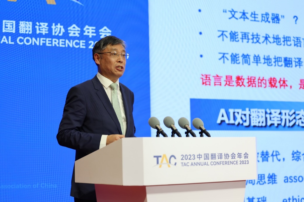 何恩培针对语言科技助力中国文化传播发表主旨演讲。他指出,在信息化时代,中国的文化传播也面临新形势,科技进步使文化呈现出多元化的传播形式和多样化的表现形式。要实现更好的国际传播效果,就需要有更好的翻译能力。而随着语言科技的不断发展,我们进入了前所未有的新翻译时代。未来,译员这个角色有可能会从传统语言翻译者转型为翻译工程师,成为既懂语言,又懂现代语言技术的复合型人才。他强调:“‘人赋慧于机器,机器赋能于人’。语言是文化的展现,是一个民族言行的根本记录。如果没有人维护这个语言体系,我们就失去了文化的传承载体。如果说语言是思想的边界,那么人类翻译就不会消失。如果说语言是思想的边界,那么人类翻译就不会消失。”