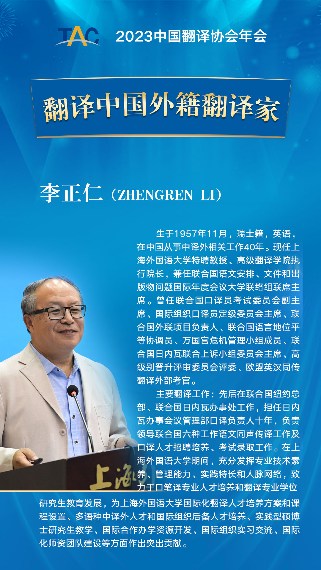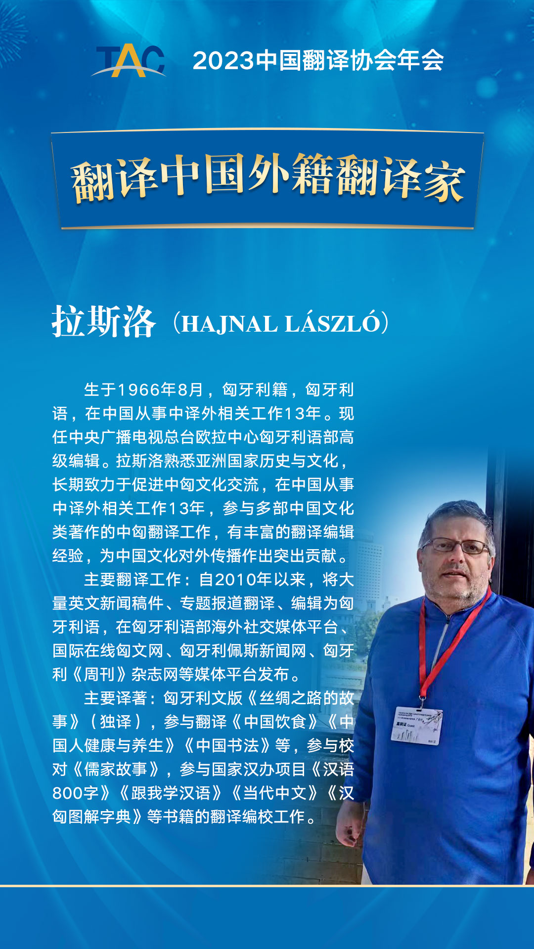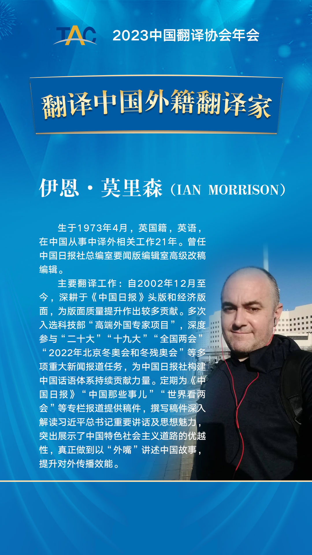 “翻译中国外籍翻译家”表彰活动由中国翻译协会于2022年设立,旨在表彰在中国从事翻译相关工作,为讲好中国故事、促进中外交流作出突出贡献的外籍翻译及国际传播专家,鼓励更多外籍专家从事中译外与国际传播工作,在对外讲好中国故事、传播好中国声音方面作出积极贡献。2023年,共有6位翻译家获奖。