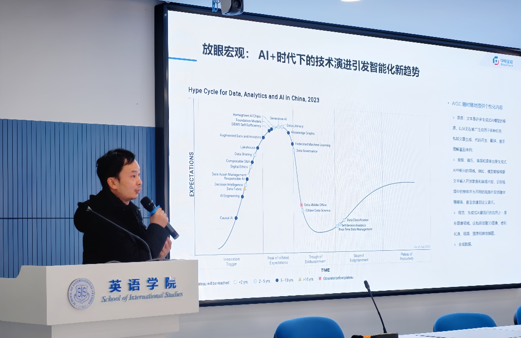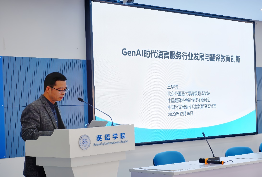 王华树先生以“GenAI时代语言服务行业发展与翻译教育创新”为题,回顾了AIGC技术的发展历程,阐述了AIGC技术在日常翻译教学和行业发展过程中的具体应用,表明AIGC技术虽然能够革新语言服务产业架构,但仍为行业规范发展带来巨大挑战。为此,语言服务行业需要以国家战略为依托,在充分发挥AIGC技术优势的同时思考应对技术伦理等难题,政产学研联合推动语言服务行业良性发展。