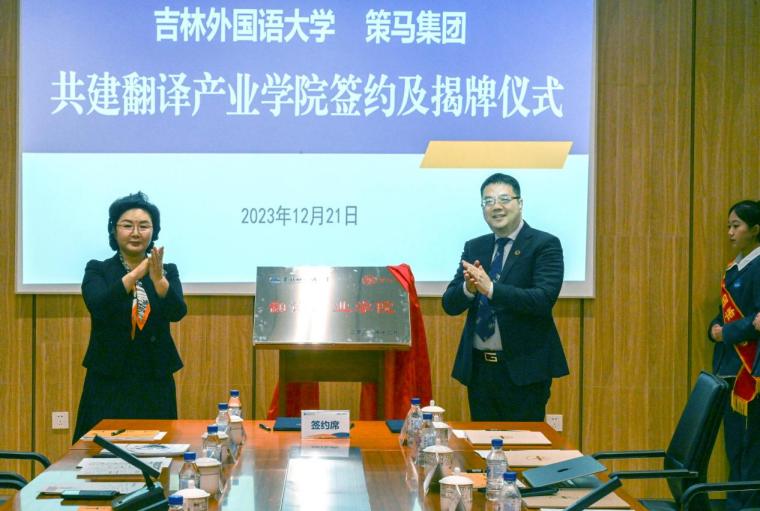 2023年12月21日,吉林外国语大学与策马集团在吉林外国语大学国际交流中心举行“吉林外国语大学策马翻译产业学院”签约及揭牌仪式。这是我国第一个由民营企业与高校共建、拥有学历证书和学位证书颁发权(本/硕)的翻译产业学院,标志着中国翻译教育领域的一次重大突破。