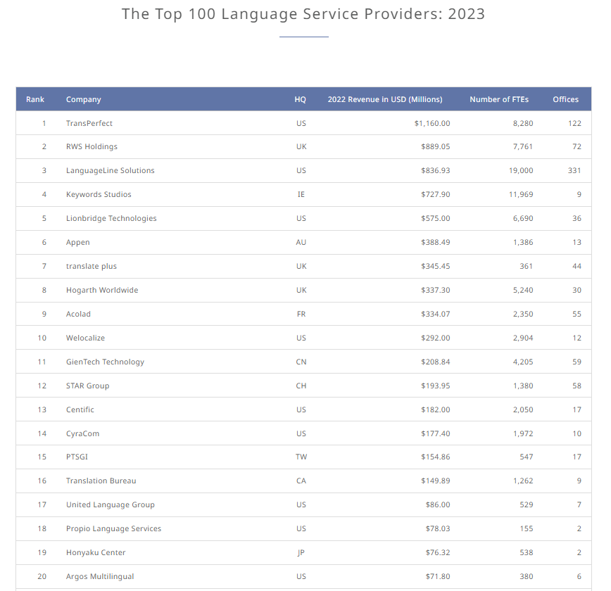 6月13日,美国语言服务咨询公司CSA Research发布2023年“全球百强语言服务商榜单”(The Top 100 Language Service Providers: 2023)。其中,中国有11家语言服务商上榜。