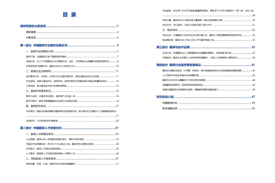 《2024中国翻译行业发展报告》主要包括四大部分。报告显示,2023年中国翻译行业呈现的主要特点有:国内翻译企业总产值继续保持稳步增长,北京是国内翻译企业数量最多的地区,信息与通讯技术、教育培训、政府外事交往是翻译业务量排名前三的领域;我国翻译人才规模持续增长,专职翻译人员数量小幅上涨,复语型人才需求增加较多,翻译人才高知化趋势明显;翻译本科专业(BTI)、翻译硕士专业(MTI)学生毕业后从事翻译工作的比例恢复上涨,我国翻译人才为国家发展大局和各领域事业提供良好支撑;经营范围中含有“机器翻译与人工智能翻译”业务的企业数量保持快速增长,广东相关企业数量继续领跑全国,翻译技术发展前景广阔,八成以上翻译企业积极拥抱大模型技术,七成以上相关院校开设有机器翻译相关课程。