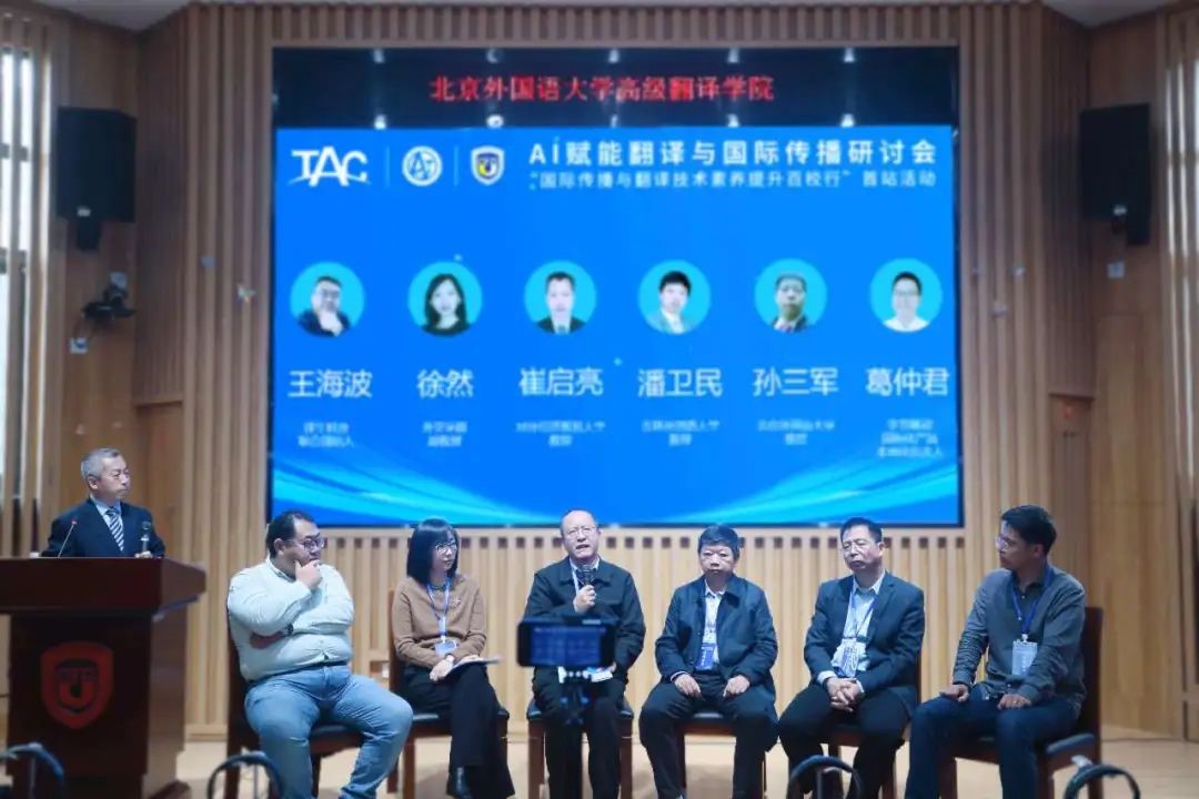 在圆桌论坛环节,吉林外国语大学高级翻译学院院长潘卫民,对外经济贸易大学英语学院教授崔启亮,北京外国语大学英语学院副教授孙三军,外交学院英语系副教授徐然,字节跳动国际化产品本地化负责人葛仲君,译牛科技COO王海波围绕“生成式人工智能时代的翻译教育”这一主题进行了探讨交流。圆桌论坛由试译宝总经理师建胜主持。