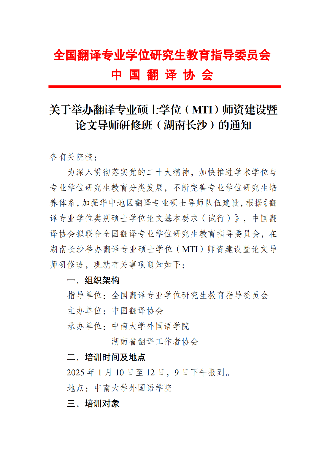关于举办翻译专业硕士学位(MTI)师资建设暨论文导师研修班(湖南长沙)的通知