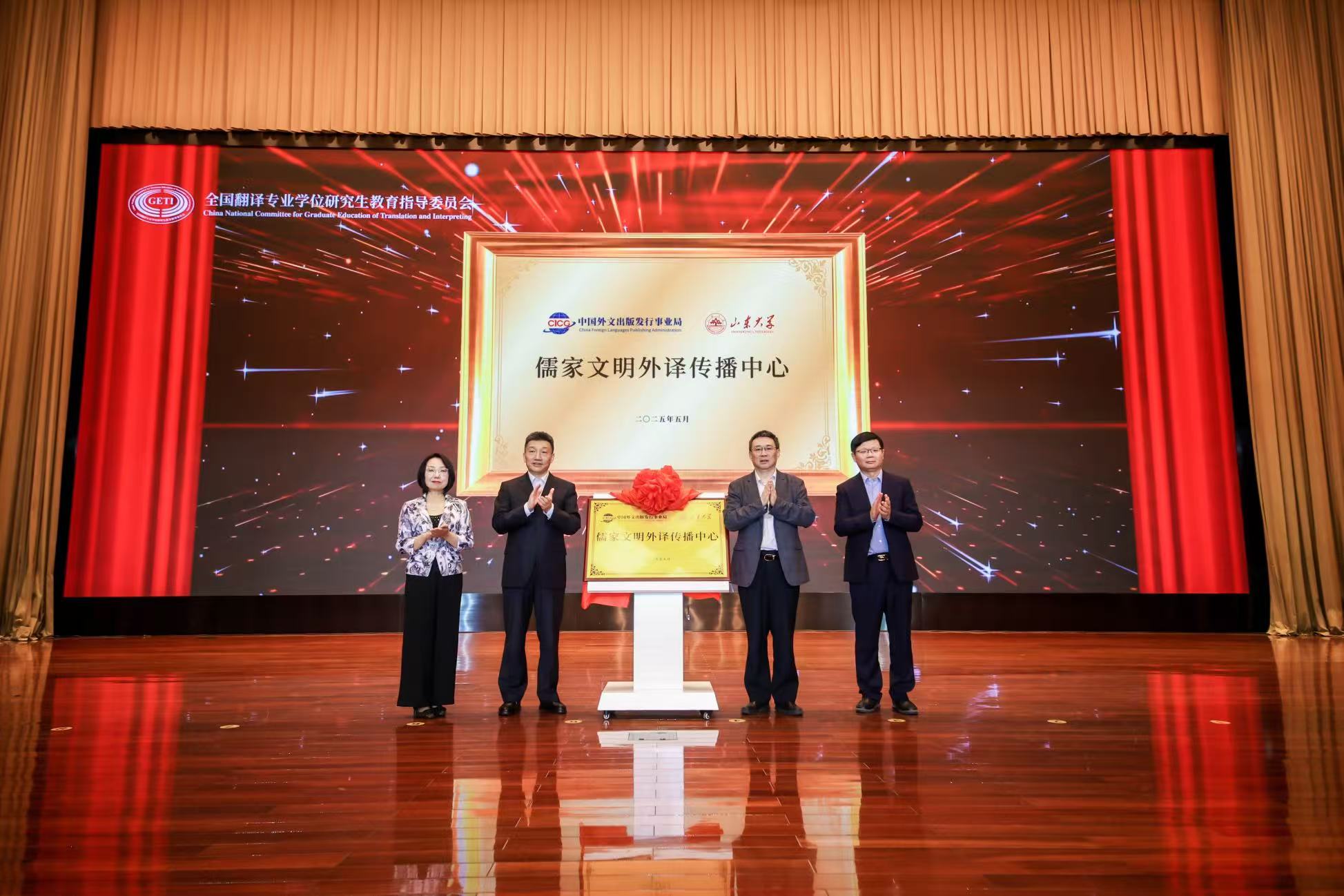 会上还举行了儒家文明外译传播中心揭牌仪式。中国外文局副局长于涛,山东大学常务副校长吴臻,中国翻译研究院副院长、教指委委员杨平和山东大学外国语学院院长、翻译学院院长马文共同为儒家文明外译传播中心揭牌。