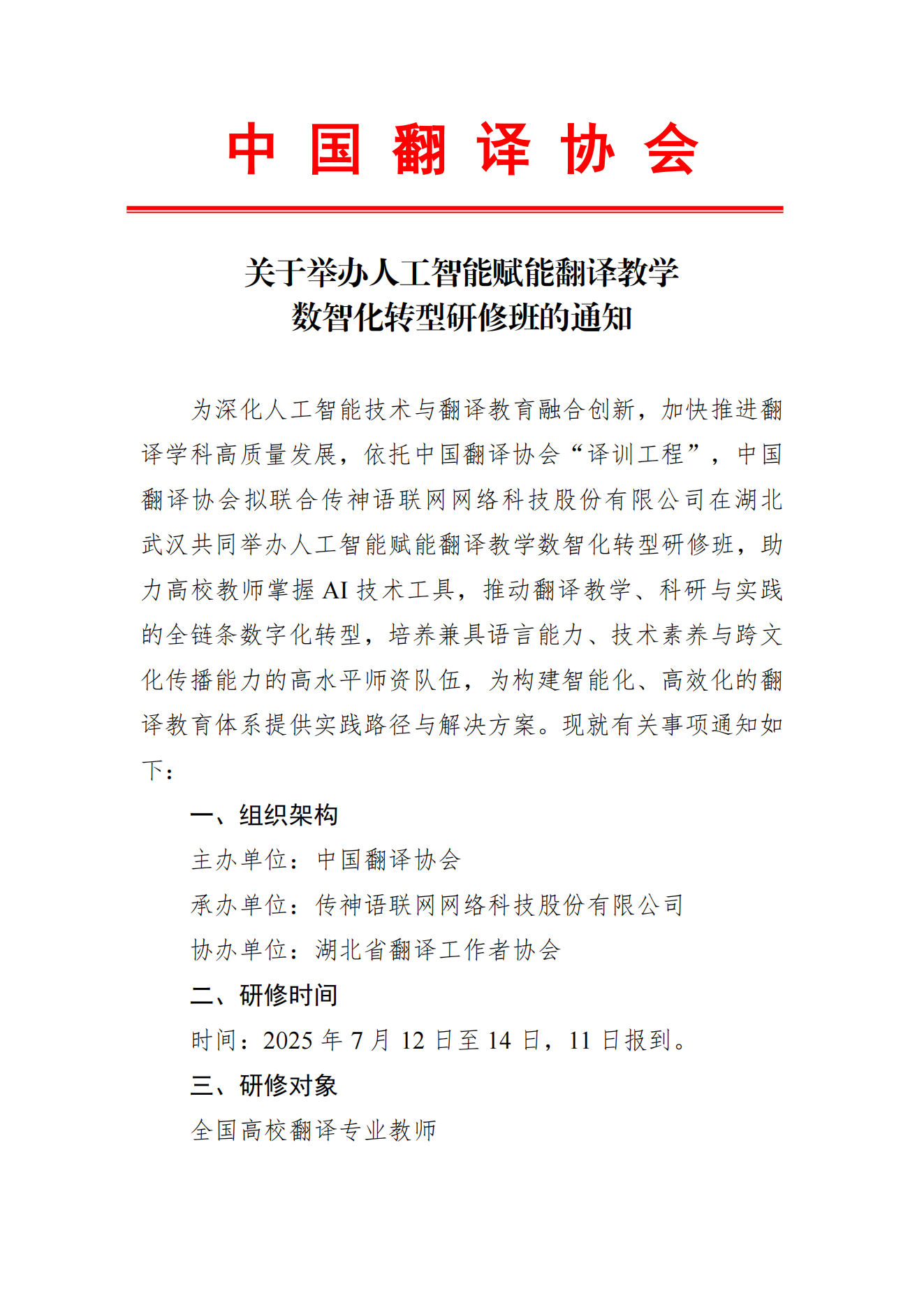 关于举办人工智能赋能翻译教学数智化转型研修班的通知