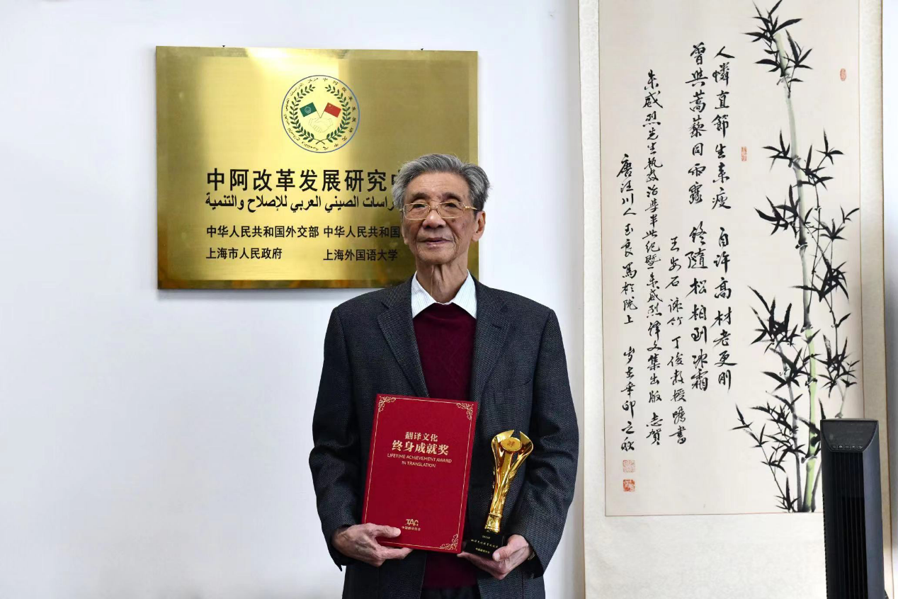 中国翻译协会领导向“翻译文化终身成就奖”获得者朱威烈颁奖